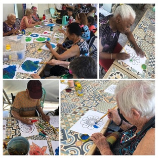 Os idosos pintaram lindos desenhos com tinta com o objetivo de estimular a psicomotricidade fina, a percepção do dentro fora, concentração, respostas a estímulos, reconhecimento de cores, formas e objetos, noção espacial, destreza manual, amplitude de movimento e uso de preensões; além de ter favorecido uma ampliação de vínculos sociais.